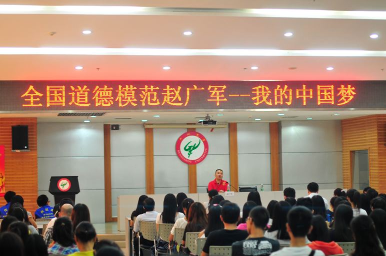 党委和校团委联合举办了主题报告会,特邀党的十八大代表、中国十大杰出志愿者、全国劳动模范、全国优秀共产党员赵广军讲述“我的中国梦”。报告会在行政西二楼报告厅举行,由快猫app