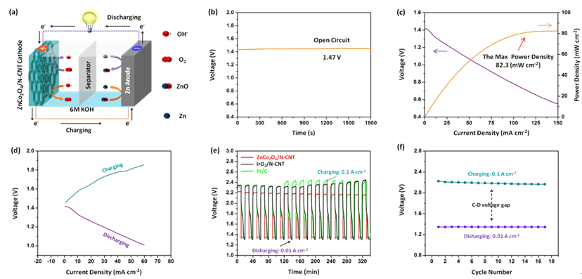 图:锌空电池构造图及ZnCo2O4/N-CNT氧电极催化性能