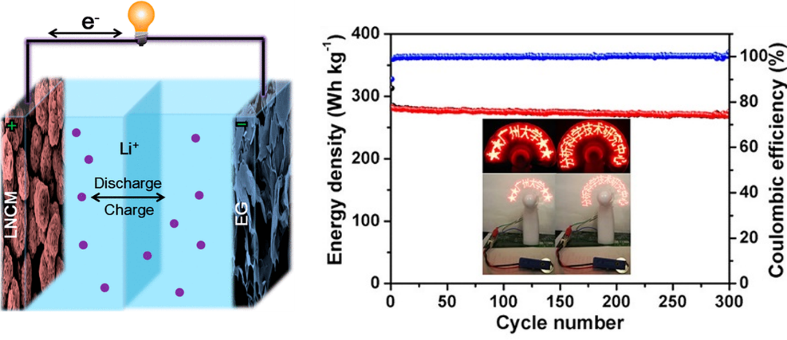 除在材料上获得的突破,牛利团队在电池组装上也取得了重要进展。该团队与中国检科院邹明强研究员和美国弗吉尼亚理工大学李征教授团队合作报道了利用电化学剥离的高质量石墨烯作为锂离子电池的负极与LiNi0.6Co0.2Mn0.2O2正极组装了全新的锂离子全电池。该全电池能量密度可达278 W h kg-1。除此之外,它也展现出了优异的倍率性能、突出的低温特性和稳定的循环特性(从室温到-30℃,电流密度为180 mA g-1时,容量保持率为100%),如此优异的性能主要得益于电化学剥离的石墨烯具有高的电子导电性和大比表面积。该研究成果最近发表在能源类国际期刊《ACS Applied Energy Materials》上,快猫app