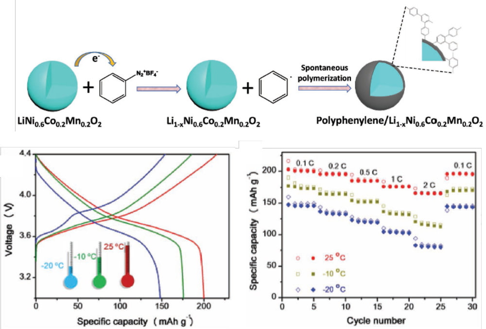 分析科学技术研究中心牛利教授团队和北京大学郭少军研究员团队合作在锂离子电池三元正极材料研究方面取得重要进展,报道了一种自发重氮盐接枝的软化学方法,成功在三元正极材料表面修饰了一层共轭聚合物(聚苯),以形成polyphenylene/LiNi0.6Co0.2Mn0.2O2复合正极材料。该聚合物层具有优异的电子/离子导电率,并且具有三维有序的多孔结构,显著地提升了锂离子电池的低温电化学性能。该研究成果最近发表在能源类国际顶级期刊《Advanced Energy Materials》 (IF=21.875)上,快猫app