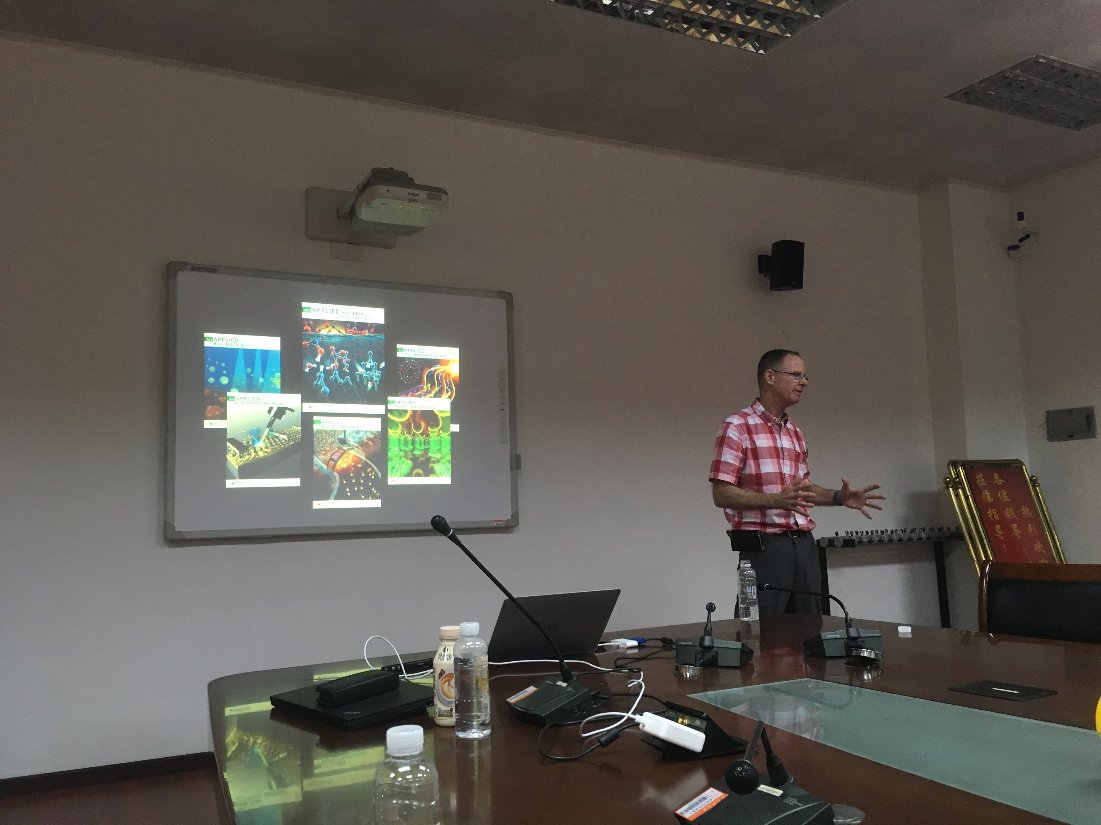,为师生作了一场题为“Chromophore-Catalyst Assemblies for Solar Fuels”的学术报告。Kirk Schanze教授从染料敏化光电反应池(DSPEC)出发,介绍了一系列染料分子与半导体催化剂结合以实现太阳能驱动生产燃料的新方法,并概述了近年来正在大力研发的分子与聚合物DSPEC组分,及其用于光电阳极驱动水氧化和用于光电阴极驱动质子还原的反应机制。