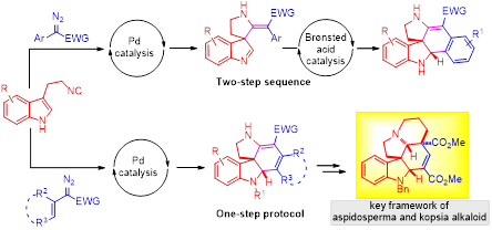 刘运林副教授课题组一直致力于吲哚啉及含氟化合物的合成研究。最近,他们在前期工作基础上进一步设计并实现了3-(2-异氰乙基)吲哚可以与重氮化合物通过交叉偶联/螺环化/Mannich-type串联反应,合成了一系列具有两个连续手性中心的多环螺吲哚啉骨架。该策略对于α-芳基取代的重氮底物,由于芳基的亲核性较弱,反应选择性生成三环螺吲哚啉化合物。在手性磷酸的催化下,这些三环螺吲哚啉化合物可以进行后续的分子内Mannich-type环化反应,进而成功实现了多环螺吲哚啉的不对称合成。该方法反应条件温和,操作简单,底物普适性广,产率较高、官能团兼容性良好。利用此方法,他们通过几步简单的化学转化简洁高效地完成了aspidosperma和 kopsia生物碱五环核心骨架的构建,为日后这两类天然产物的全合成提供了新的研究思路与方法。此外,该研究工作进一步丰富了3-(2-异氰乙基)吲哚的反应模式,为多环螺吲哚啉的合成提供了新路径,产物有望在药物研发中得到应用。该研究成果最近发表在化学类顶级期刊《德国应用化学》(IF= 12.25)上,获国际同行评审专家的高度评价:(1个high important,1个very important),并受编辑邀请制作封面。快猫app