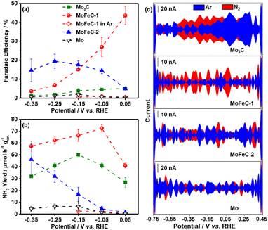 彭峰教授团队受生物固氮酶活性位点(Mo-Fe)的启发,研究合成了用于ENRR的钼铁碳化物(Mo3Fe3C)电催化剂,该催化剂在电化学氮还原反应中,氨产率为72.5 μmol h-1 gcat.-1,稳定性好,10 h生产氨的平均法拉第效率为28.2%;理论计算表明,Mo-Fe协同作用可以有效活化N2分子,降低ENRR过程中形成*N2H所需的能量,促进了N2的电化学还原;该研究创新性地采用傅里叶变换交流伏安法(FTACV)来表征ENRR过程中的电子转移,这是一种快速、灵敏、有效的评价催化剂ENRR性能的方法。本研究为设计与评价高活性、高选择性的ENRR催化剂提供了新的思路和方法。彭峰教授为该论文的通讯作者,快猫app