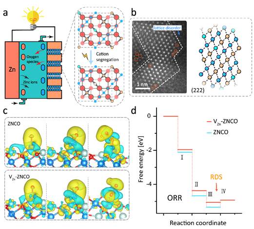 图1. a) 液流式锌空电池的概念图,b)高分辨TEM图,c)差分电荷密度d) 反应自由能计算