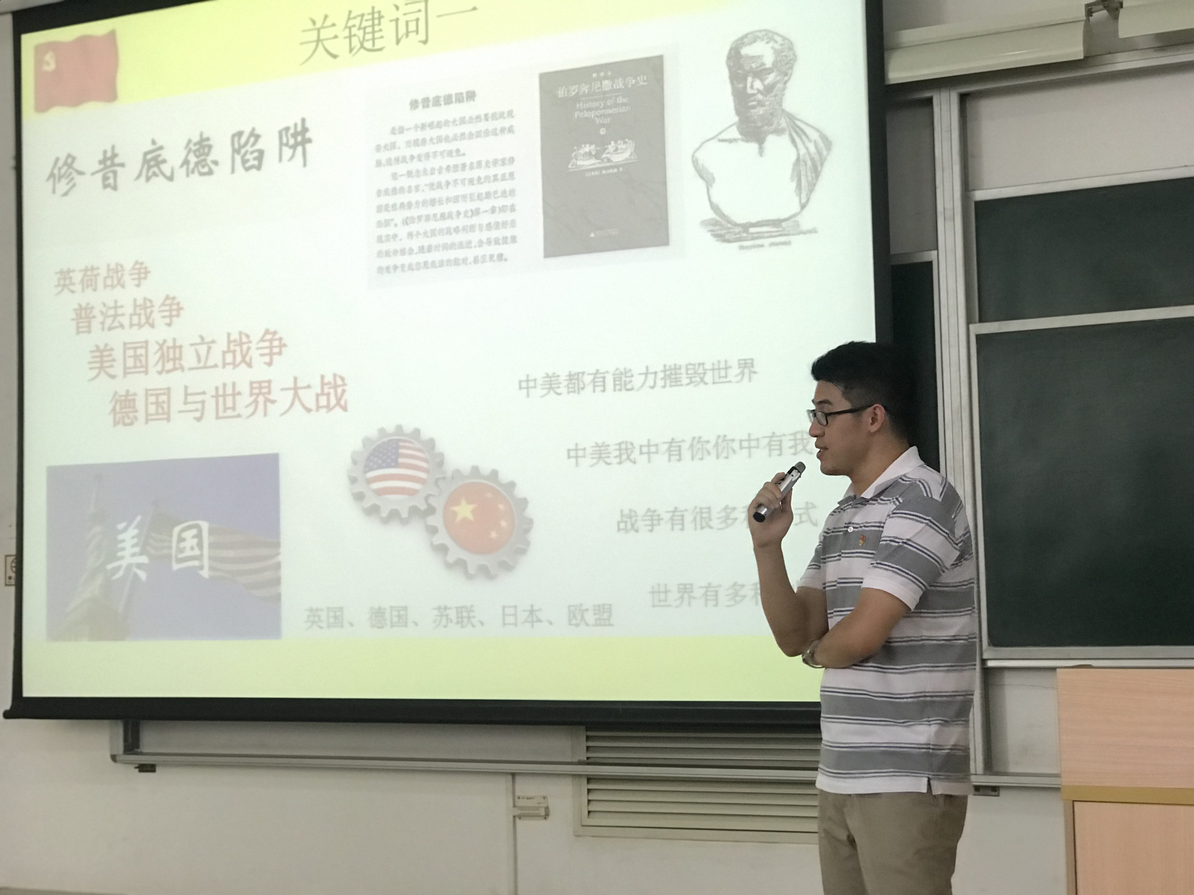 习近平总书记说,科技是国家强盛之基,创新是民族进步之魂。在21世纪,国家的科技实力已经成为国家综合实力的一个重要标志,国家与国家之间的科技竞争也成为了国家竞争的焦点。尤其在当今国际形势风云变幻莫测的时代,中国该如何在科技的进步与发展中实现中华民族的伟大复兴之路,是摆在所有科技工作者面前的重要课题。袁杨同志围绕当今科学、技术和社会的相互关系,以“修昔底德陷阱”、“美国政党”、“百年未有之大变局”为线索详细分析了当前中美关系及局势,提及目前我国发展的内部条件和外部环境正发生深刻复杂的变化,展示中美竞争的领域,提出应对中美博弈升级的举措,强调中美战略竞争已基本转向科技竞争,面对科技围堵,自力更生或将是最好的科技发展策略。袁书记更鼓励青年一代作为世界新发展格局的主力军,要抓住机遇,迎接挑战,在新时代的背景下书写新的发展。袁书记的党课内容丰富有层次,表达生动吸引人,同学们聆听得非常认真,相信本次党课将进一步加强党员和入党积极分子对中美关系实质性的认识,激发同志们爱国爱党、忧国忧民的家国情怀。