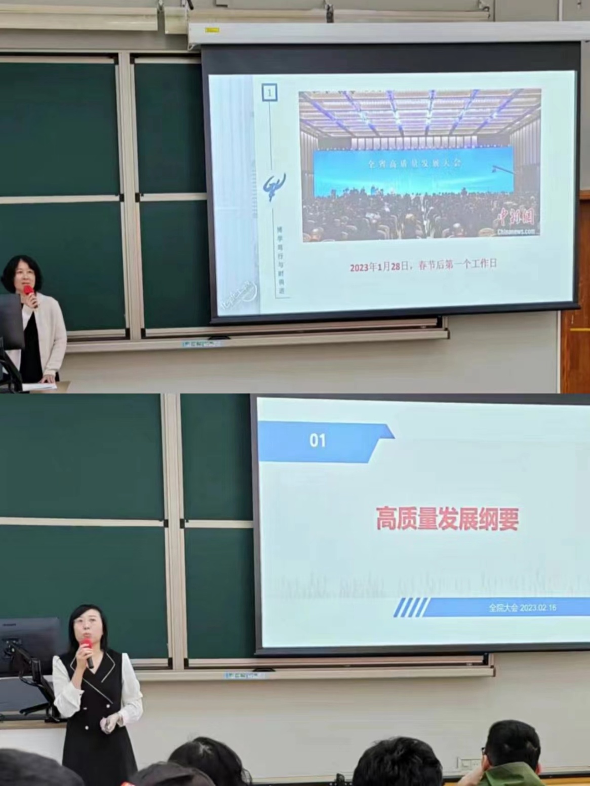 党委周海兵书记向全体老师传达了省、市高质量发展大会的精神,韩冬雪院长传达了学校高质量发展大会精神,用详尽的数据分析了快猫app