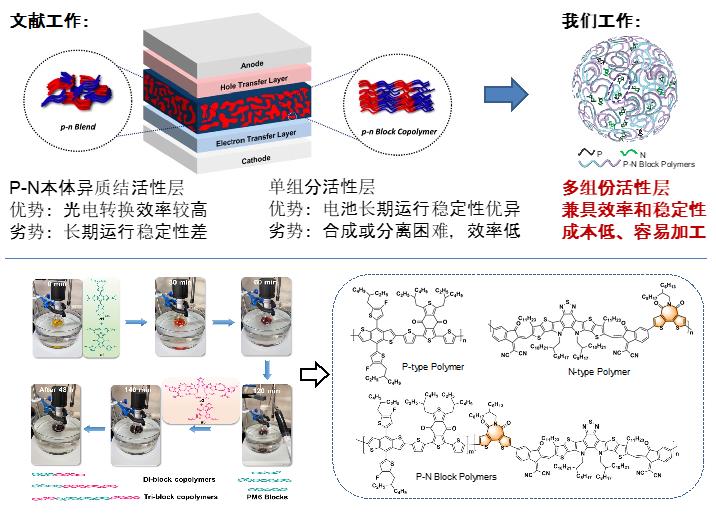 针对此,牛利院士团队通过简单的多组份连续聚合方法发展了多组份全聚合物半导体材料,将其直接作为光活性层的太阳能电池不仅展现出高的光电转换效率而且表现出优异的光热稳定性,实现了有机光伏器件效率和使用寿命之间的平衡。此外,该项活性层制备技术大幅度降低了有机光伏材料的制备成本并且简化了器件制备工艺。更重要的是,通过深入的光电和形态学特性表征,作者发现在多组份活性层中具有主链缠结的嵌段聚合物和少量低聚物协同作用有助于“冷冻”活性层中形成的纳米尺度的互穿网络形貌,以及电池在长期运行时载流子传输平衡。这些发现为开发低成本和长期稳定的有机光伏电池提供了理论和实验室依据。该技术结合喷涂、刮涂等大面积加工工程技术有利于实现有机光伏规模化生产。