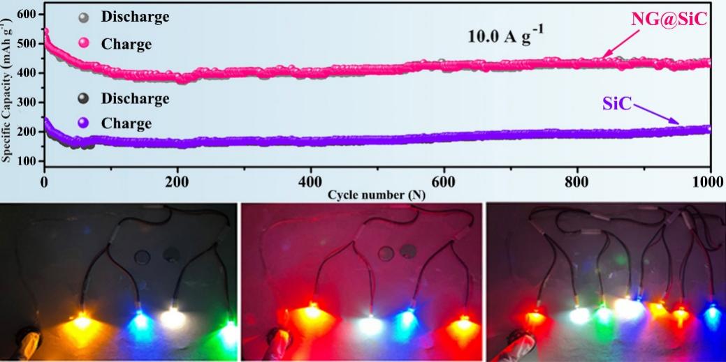 对于锂离子电池来说,负极材料是影响电池整体性能的重要因素。因此,寻找具有高容量和优异循环性能的新型负极材料对于开发下一代锂离子电池至关重要。碳化硅(SiC)具有较高的物理和化学稳定性,比如:高的电子迁移率、低的热膨胀系数、以及高的机械强。因此,SiC材料在能量存储与转化领域受到越来越多的重视。SiC的晶格特点有利于自身脱锂和嵌锂,已经成为研发能量密度高、充电快,功率密度大和寿命长的高性能锂电池负极材料的热点。然而,SiC存在电子电导率低,离子内部扩散慢,以及表面易形成致锂钝化的固体电解质界面(SEI)膜等缺陷,会造成电池循环性能与库伦效率的降低。为了解决这些问题,大多数研究组采用了表面石墨化、构建壳状结构等方法,希望改进SiC电极的缺陷,提高锂电比容量和循环性能。相比而言,基于界面工程研究可通过表/界面化学键的构筑,解决SiC电导率低和离子内部扩散效率低的问题。