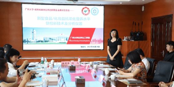 党支部作为全国党建工作样板支部、广东省“双带头人”党支部书记工作室和全国“双带头人”强国行团队,始终坚持“党建引路、科研赋能、产业融合”理念。会上,韩冬雪教授重点介绍了团队在贵州金刺梨等特色抗氧化水果方面的研究积累,依托自主研发的光电化学快速检测技术与仪器系统,已构建起覆盖原料筛选、活性评价、功能开发的产业化技术链。该成果对湖南省“十大特色水果”如猕猴桃、黄金桃、柑橘等的功能因子开发与高附加值应用具有重要示范作用。科研团队还展示了相关食品与化妆品营养评价平台建设成果,围绕功能成分筛选、抗氧化与美白指标快速检测、活性成分稳定性验证等环节提出服务路径。与会各方就如何构建“科技+营养+健康”协同创新体系,推进地方果品资源向大健康产品转化、实现产业精准赋能展开深入探讨。
