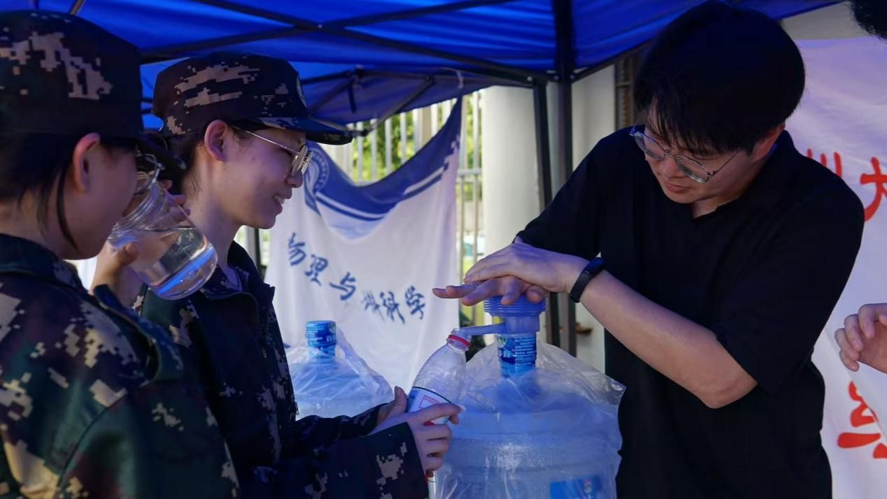 与此同时,化院志愿者也在训练场上搭起帐篷,设立了“军训补给站”,为新生们提供充足的矿泉水以及应急药品。这份“后勤保障网”,让新生们得以全身心投入训练之中。