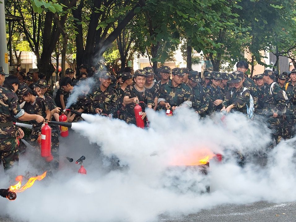 军训不仅是体能的锤炼,更是安全意识的培养。消防演习环节,新生们沉浸式学习应急技能:模拟火情现场,浓烟中大家迅速弯腰捂鼻,沿安全通道有序撤离;灭火器实操教学时,认真聆听“提、拔、握、压”口诀,亲手操作扑灭明火,将安全知识从理论转化为实战能力,为校园生活筑牢安全屏障。